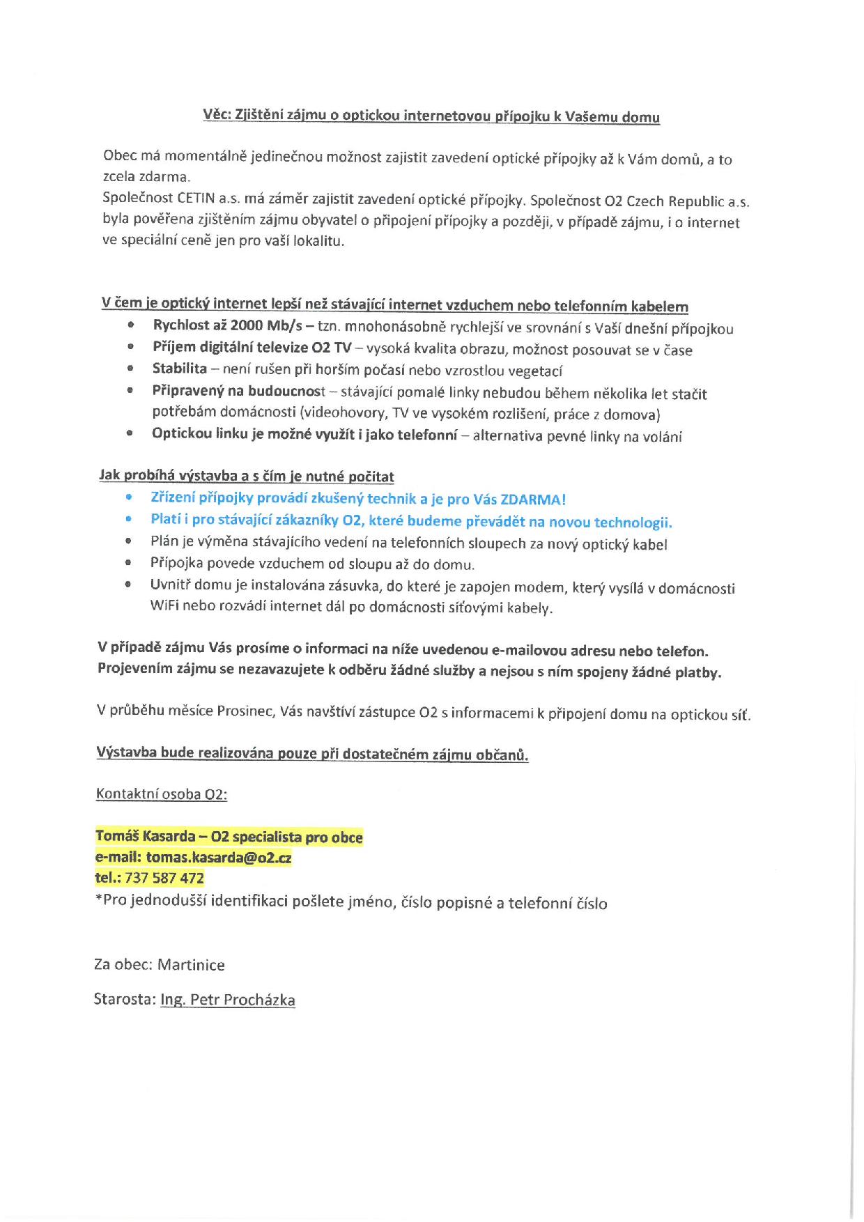 Nabídka zřízení optické internetové přípojky v části obce Březnice - Martinice u Březnice