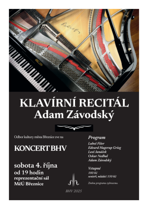 Vystoupí Adam Závodský s klavírním recitálem v reprezentačním sále MěÚ Březnice. Program: Luboš Fišer, Edvard Hagerup Grieg, Leoš Janáček, Oskar Nedbal, Adam Závodský. Vstupné 180 Kč / senioři a mládež 150 Kč. Vstupenky k zakoupení v březnickém infocentru během měsíce září.